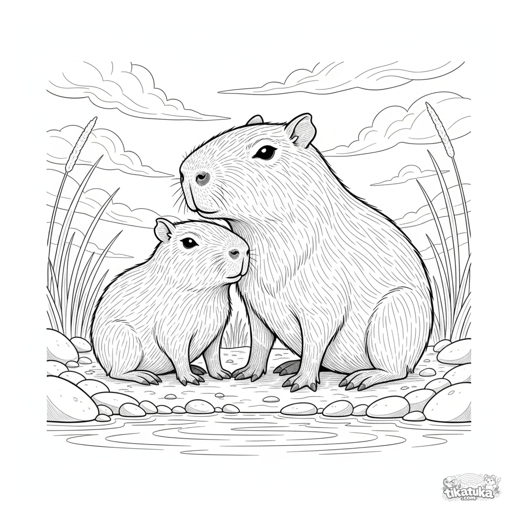 Página para colorir detalhada para 10-12 anos: uma capivara pai e seu filhote observando o pôr do sol no rio. Cena sobre ternura, calma e vínculo familiar.
