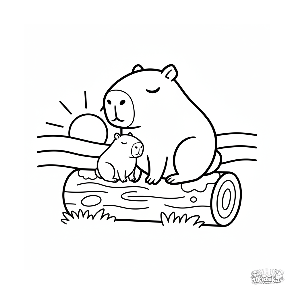 Página para colorir simples para crianças pequenas de 2-3 anos: um filhote de capivara e seu pai sentados num tronco, observando o pôr do sol. Formas grandes, poucos detalhes.