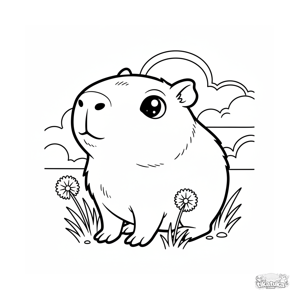Uma página para colorir de Capivaras e relax com nível Fácil. Ela combina com a idade 2-3 anos, imprime bem em casa e abre imediatamente no modo online.