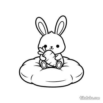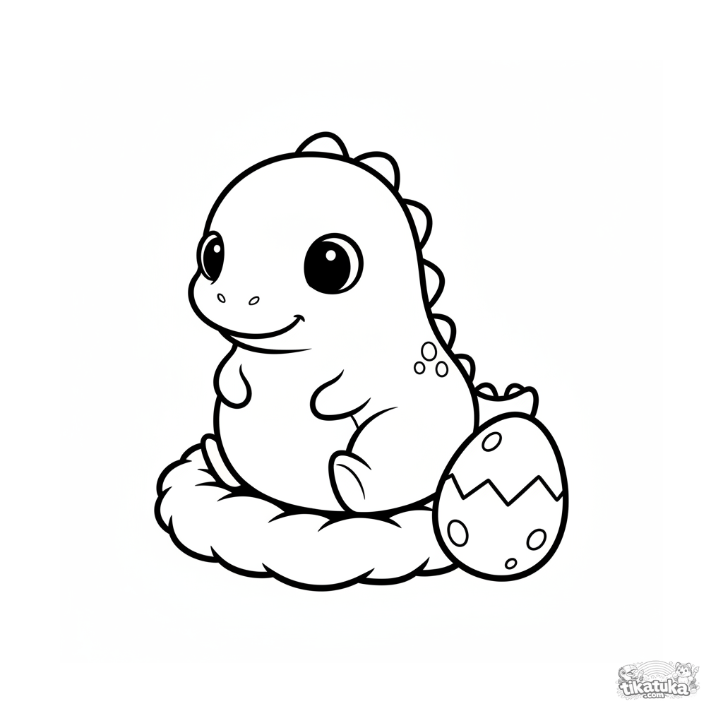 Página para colorir para crianças de 2-3 anos: um bebê dinossauro fofo em forma de pêra senta em uma almofada olhando para um ovo grande. Contornos suaves.