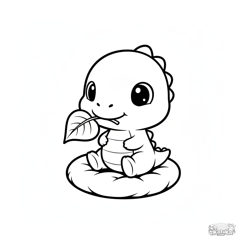Página para colorir para 2-3 anos: um bebê dinossauro fofo com uma folha na boca sentado em um travesseiro. Cabeça grande, formas simples, margens amplas.