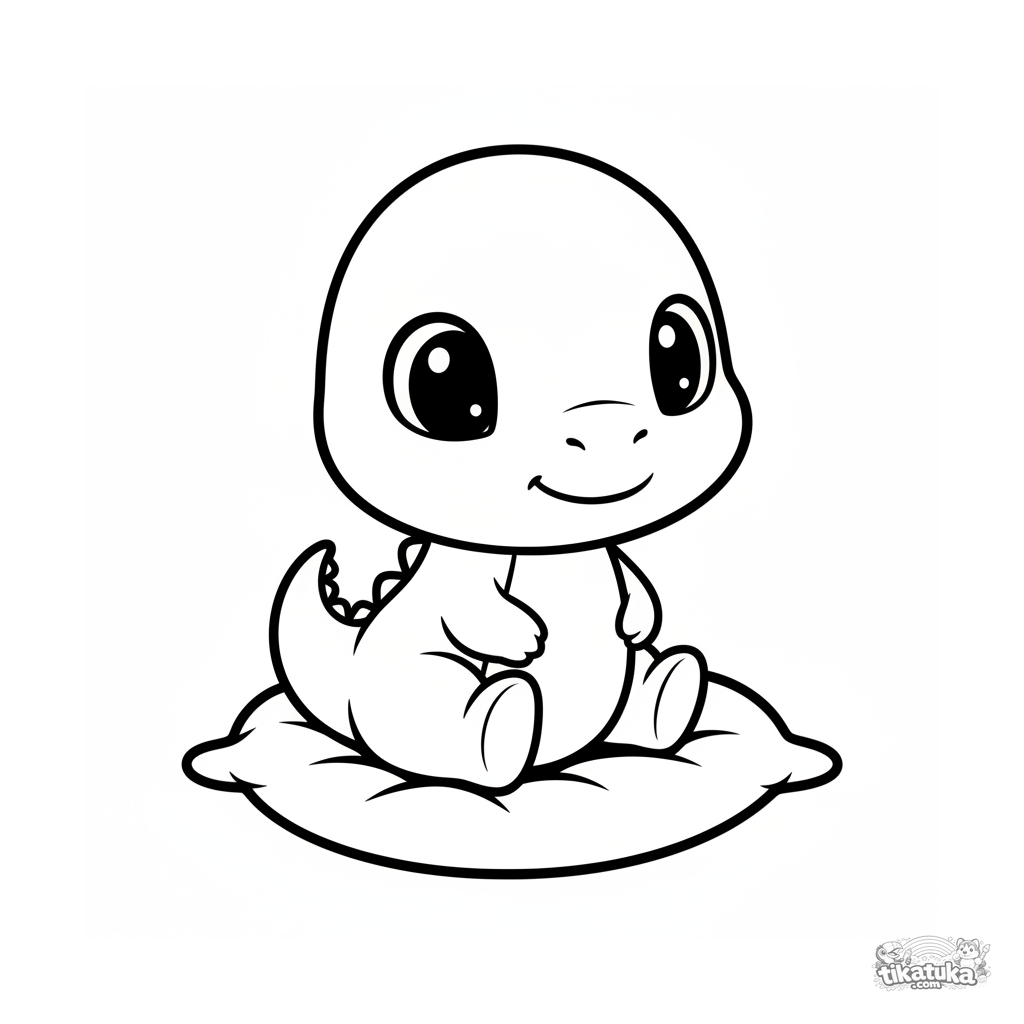 Página para colorir para os bem pequenos: um fofo bebê dinossauro estilo chibi sentado em um travesseiro. Cabeça grande, formas simples, sem detalhes desnecessários.