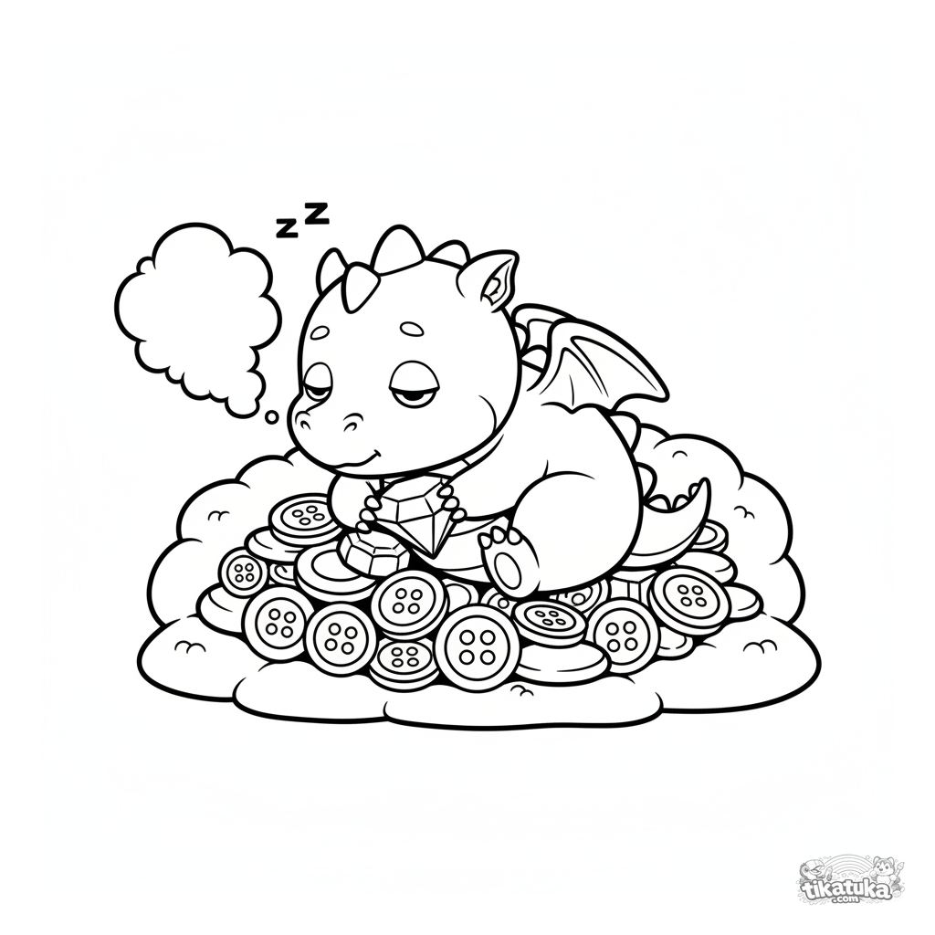 Página simples para colorir para crianças pequenas 2-3: um fofo bebê dragão dorme em uma pilha de bugigangas brilhantes. Formas grandes e claras, poucos detalhes.