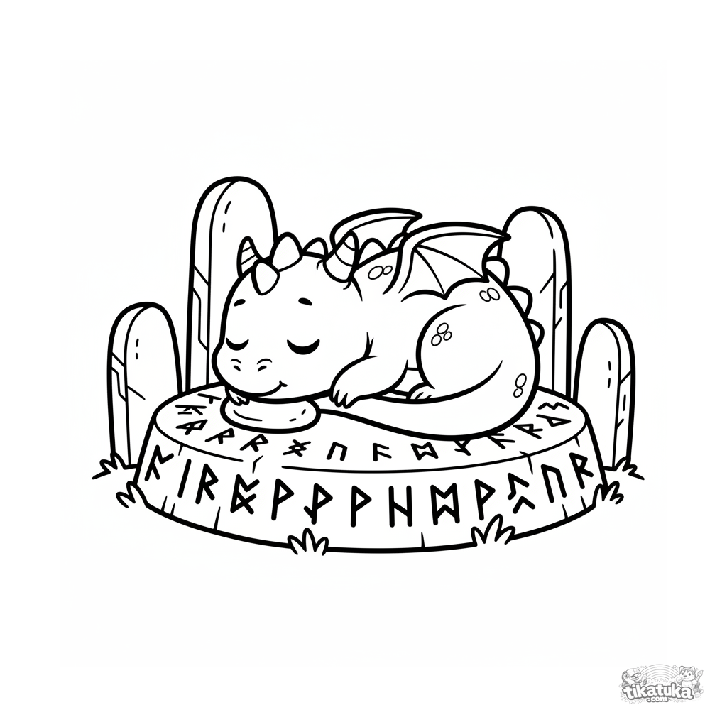 Página para colorir para crianças pequenas: um bebê dragão dorme tranquilamente em uma antiga pedra rúnica. Formas simples e grandes.