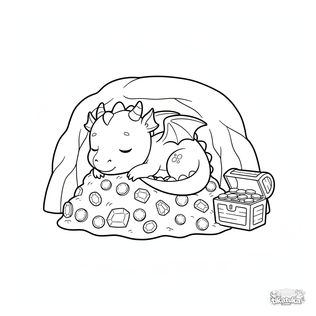 Página para colorir fácil para bebês de 2-3 anos com um bebê dragão dormindo em um tesouro de gemas. Formas grandes e margens amplas.