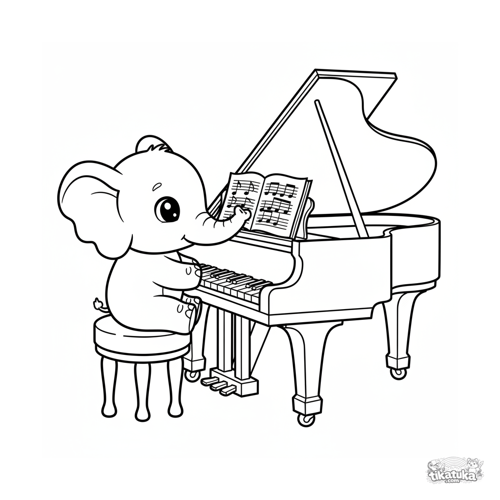 Página para colorir simples para bebês 2-3: um bebê elefante fofo explora um grande piano de cauda no palco.