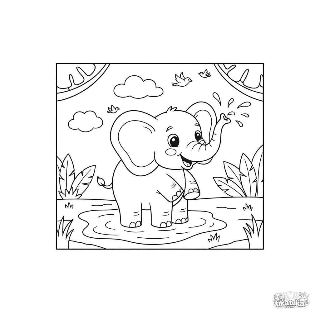 Página para colorir divertida para crianças pequenas: um elefantinho brinca em uma poça de lama. Formas grandes e simples, para 2-4 anos.