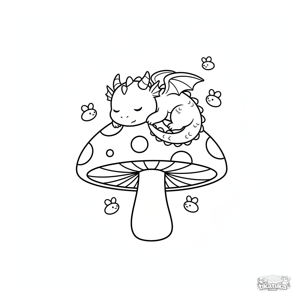 Página para colorir para bebês de 2-3 anos: um dragão minúsculo dormindo em um cogumelo. Formas grandes e muito simples, perfeita para primeiros lápis.