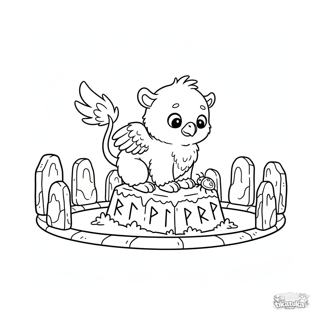 Página para colorir para bebês: um filhote fofo de grifo empoleirado em uma antiga pedra rúnica. Linhas simples, formas grandes, perfeito para crianças de 2-3 anos.