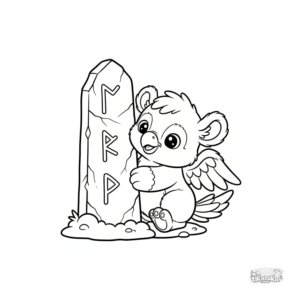 Página para colorir para crianças pequenas: um filhote de grifo fofinho espiando atrás de um monólito rúnico. Formas simples, margens amplas.