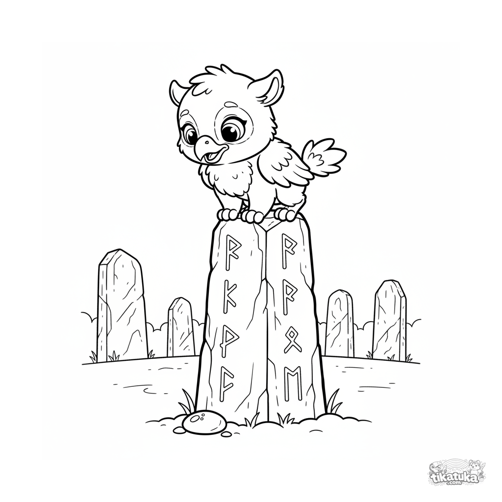 Página para colorir para crianças 4-6: um filhote de grifo curioso empoleira-se em um antigo monólito rúnico. Formas simples, personagem amigável.