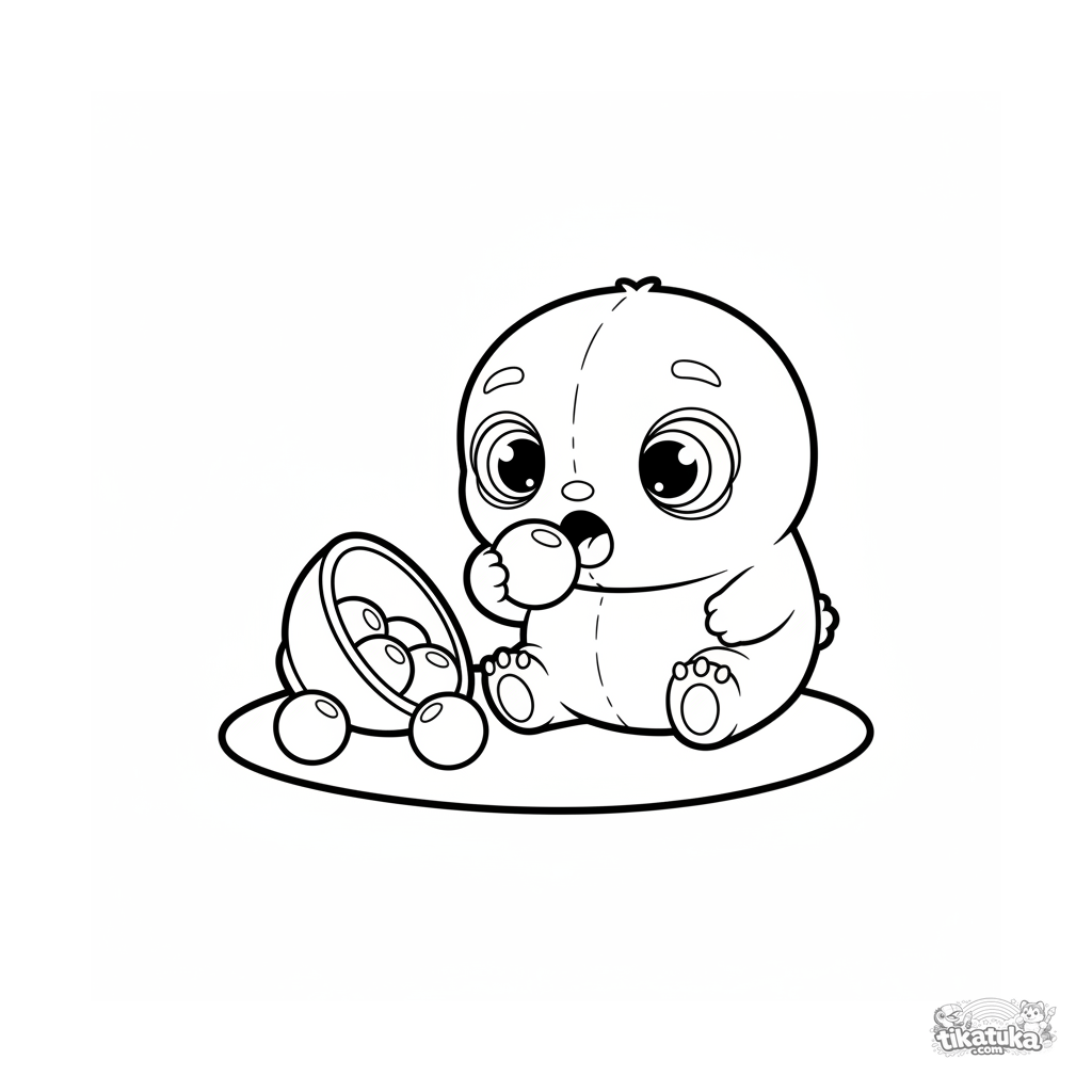 Página para colorir muito simples para bebês 2-3: um bebê monstro provando uma frutinha em um piquenique. Margens brancas enormes, uma figura grande.
