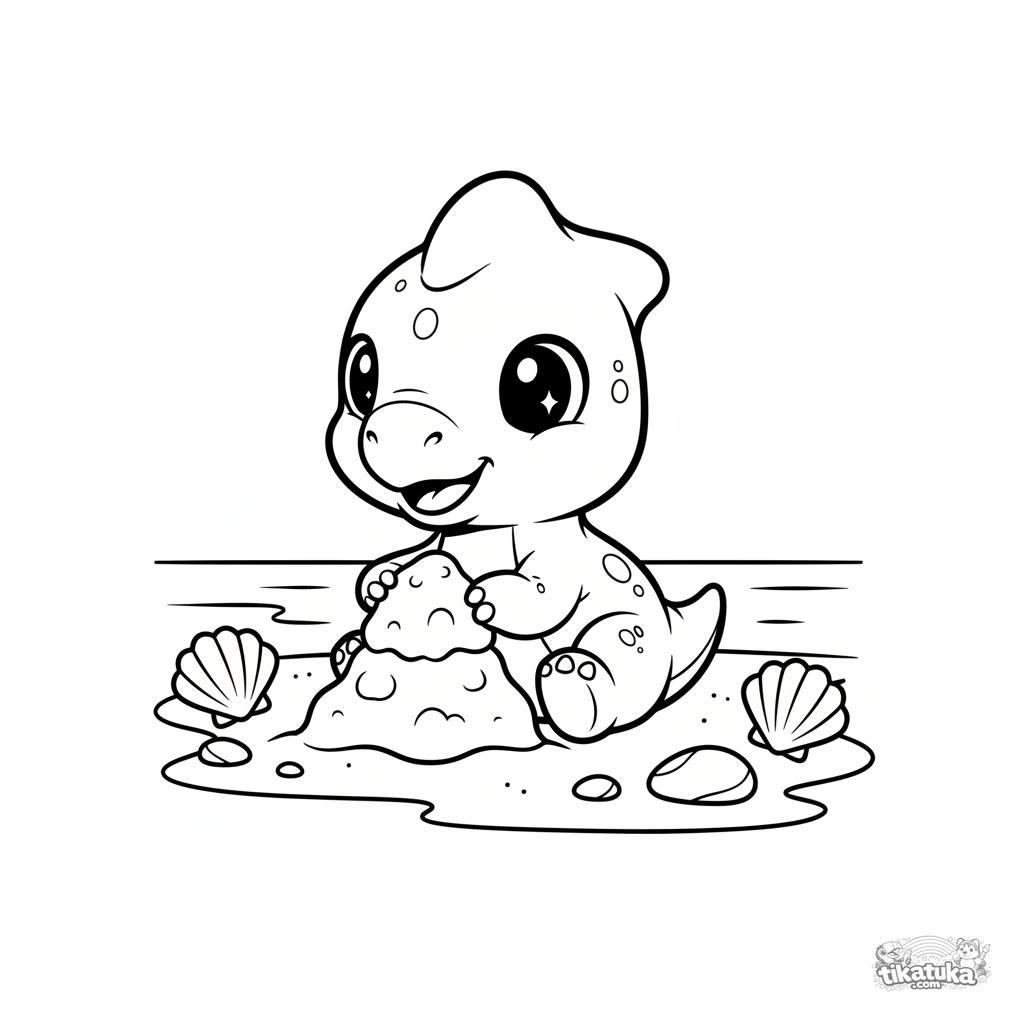 Página para colorir para crianças de 2-3 anos: um filhote de parassaurolofo constrói um castelo de areia em uma praia oceânica antiga. Formas grandes e simples.