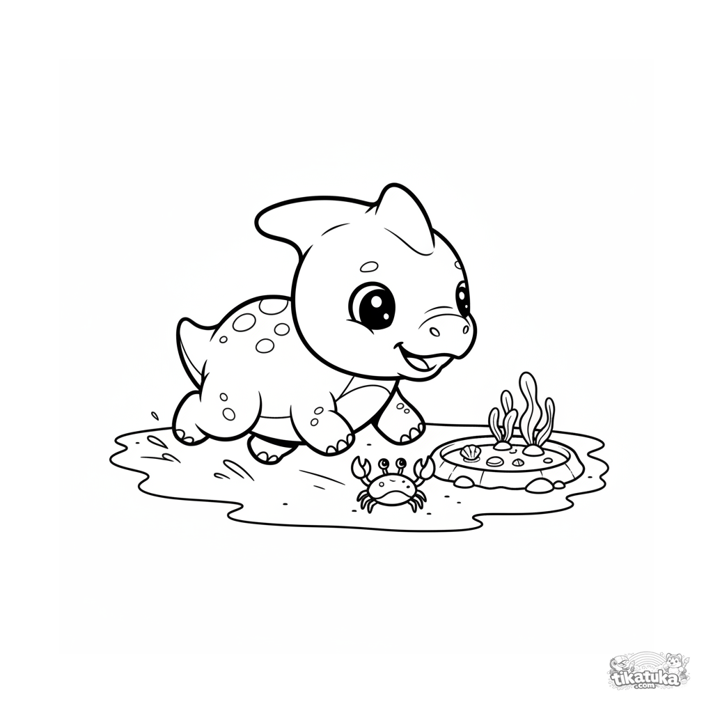 Página simples para colorir para bebês de 2-3 anos: um filhote de parasaurolofo persegue um caranguejinho em uma praia antiga. Formas grandes, poucos detalhes.