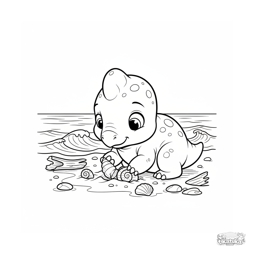 Página para colorir para crianças 4-6: um filhote de parassaurolofo explora a praia de areia de um oceano antigo, procurando por conchas. Cena fofa para desenvolver a motricidade fina.