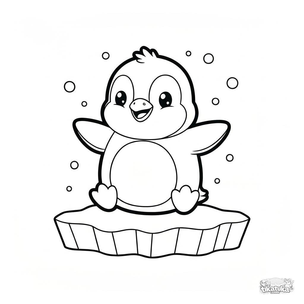 Página fofa para colorir de pinguim bebê para crianças 2-5. O bebê anda em um bloco de gelo, a imagem tem formas grandes e tema claro.