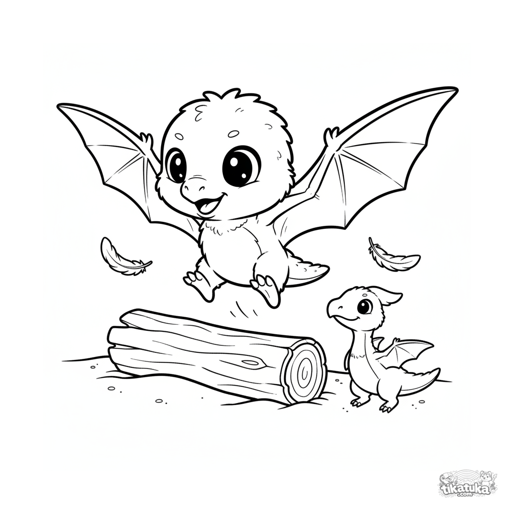Página para colorir simples para crianças de 2-3 anos: um bebê pterossauro fofo faz seu primeiro voo de um tronco em uma praia antiga.