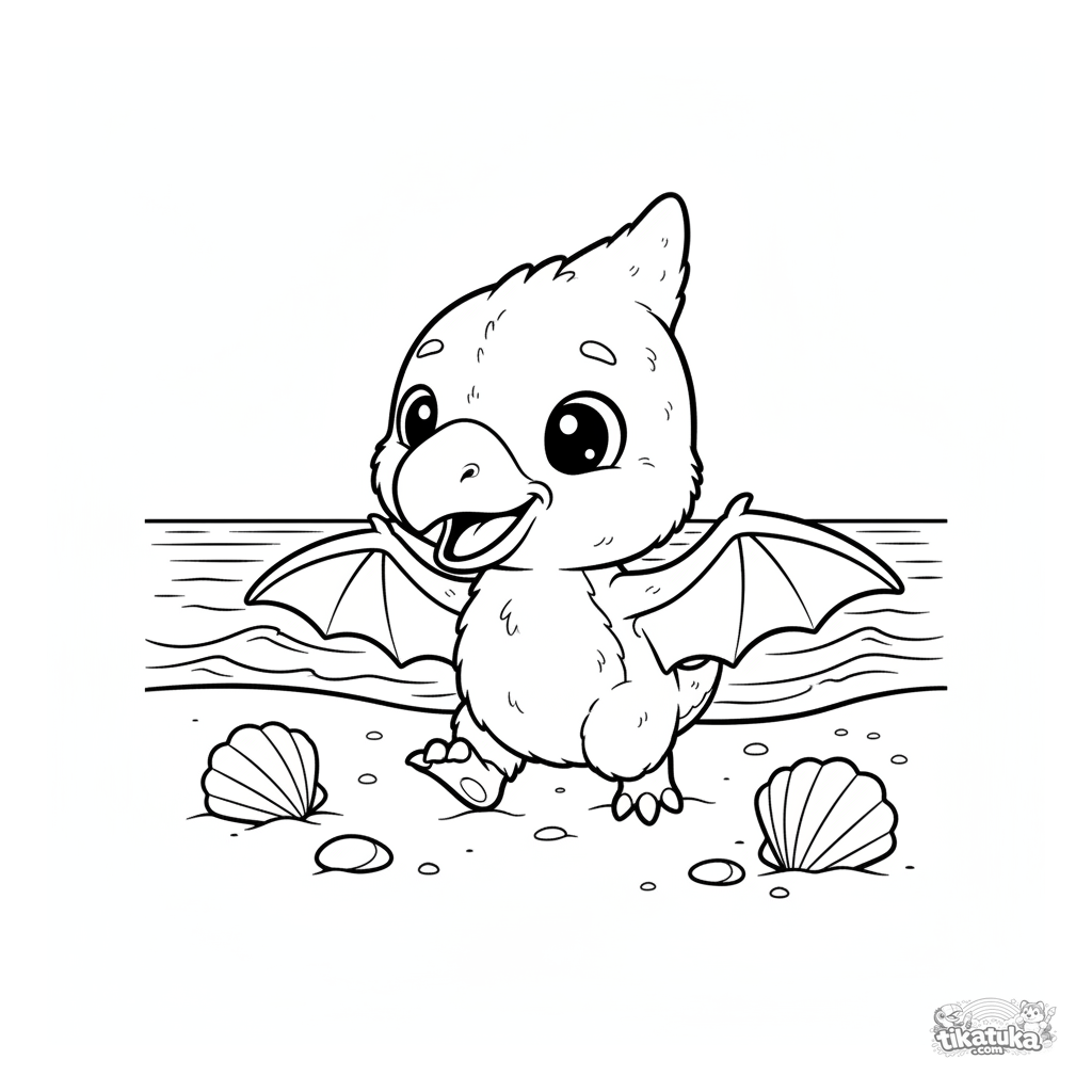 Página para colorir para bebês 2-3 anos: um bebê pterossauro fofo dando seus primeiros passos na areia de uma praia antiga.