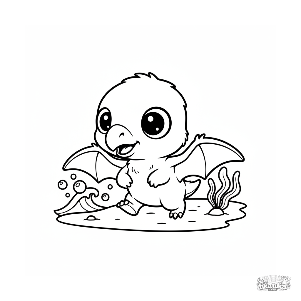 Página para colorir simples para crianças pequenas de 2-3 anos: um bebê fofo de pterossauro dando seus primeiros passos na areia molhada de um oceano antigo. Formas grandes, poucos detalhes.