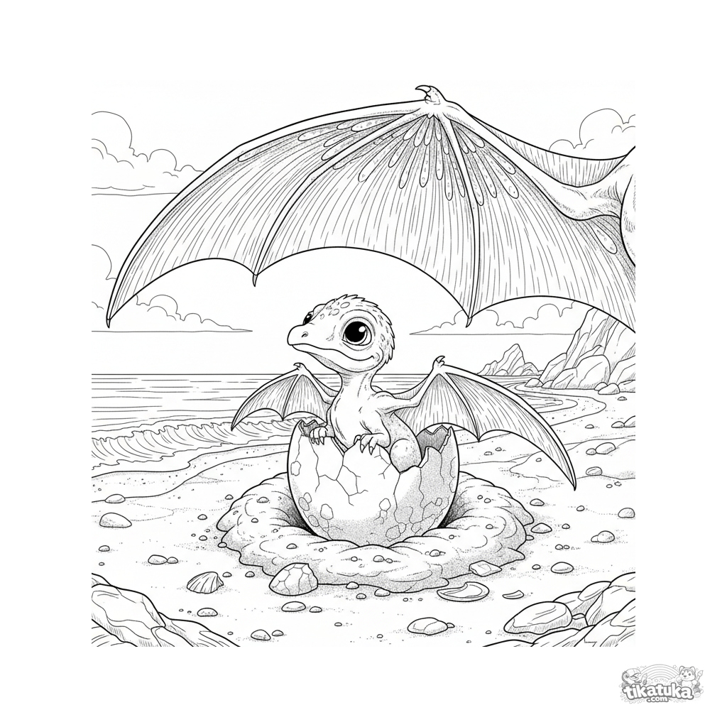 Página para colorir para crianças mais velhas 10-12: um bebê pterossauro choca em uma praia oceânica antiga. Estilo realista de guia de campo, corpo inteiro, margens amplas.