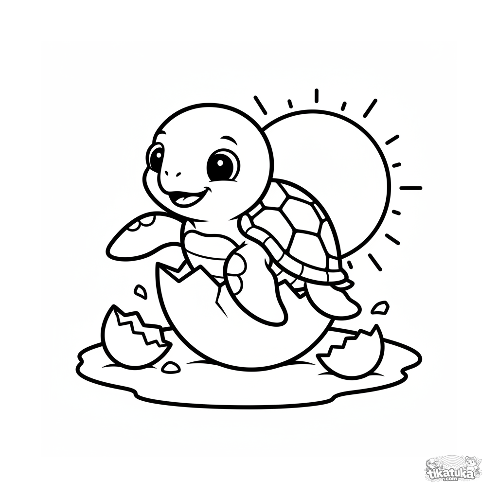 Página simples para colorir para crianças pequenas: filhote de tartaruga marinha nascendo em um banco de areia ensolarado. Formas grandes, mínimo detalhe, para 2-3 anos.
