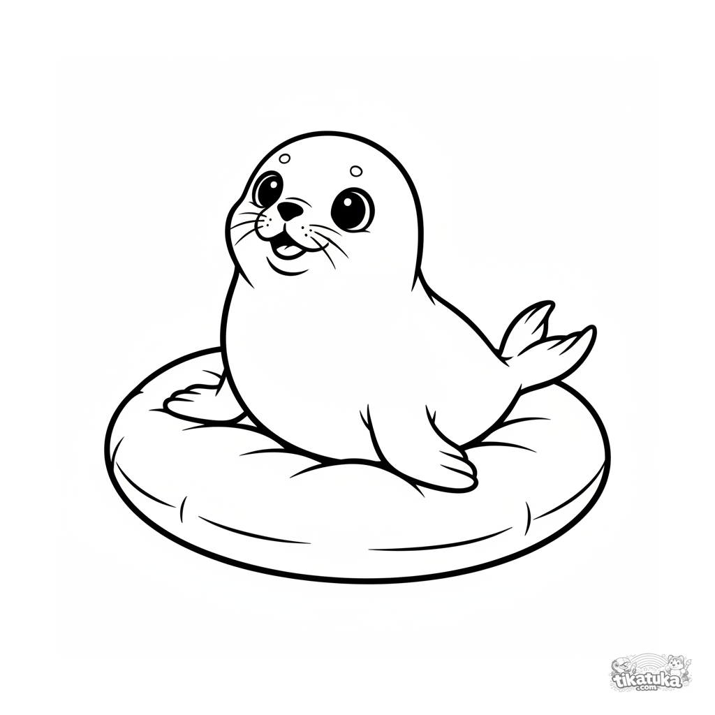 Página para colorir para 2-3 anos: uma foca bebê fofa e gordinha deita-se em um travesseiro. Formas arredondadas, olhos grandes e gentis.