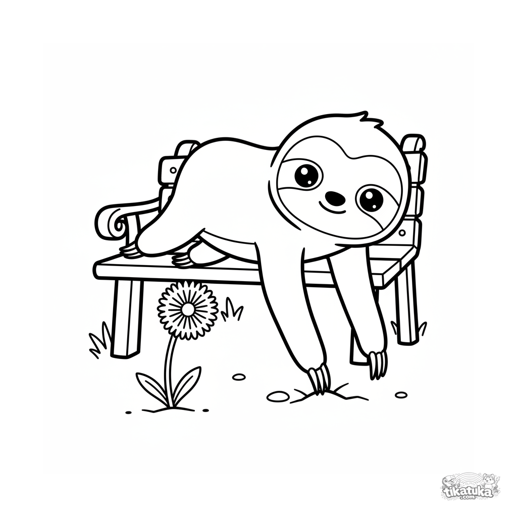 Página muito simples para colorir para bebês 2-3: um bebê preguiça pendurado no braço de um banco de parque. Design minimalista com contornos grandes.