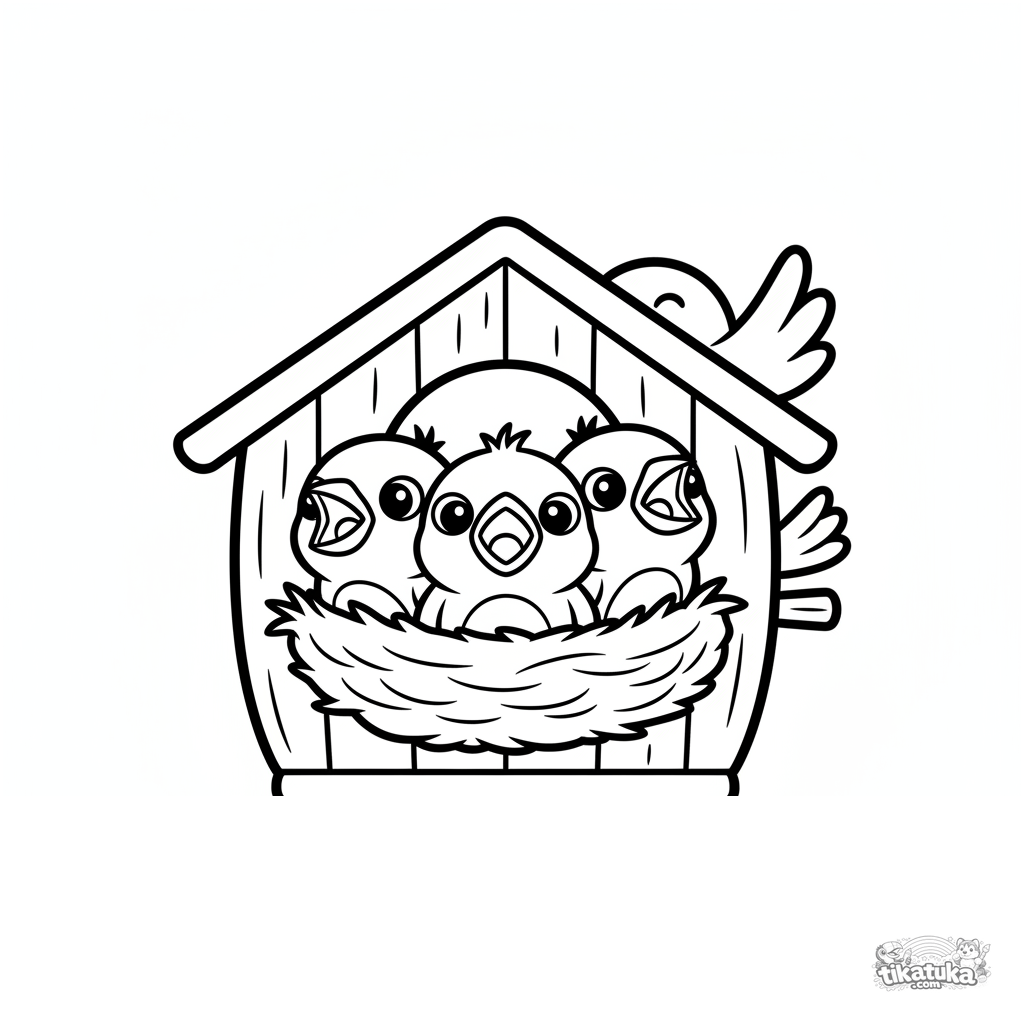 Página para colorir para crianças pequenas 2-3: três filhotes fofinhos de pardal em um ninho aconchegante dentro de uma casinha de pássaros de madeira. Formas grandes e simples, poucos detalhes.