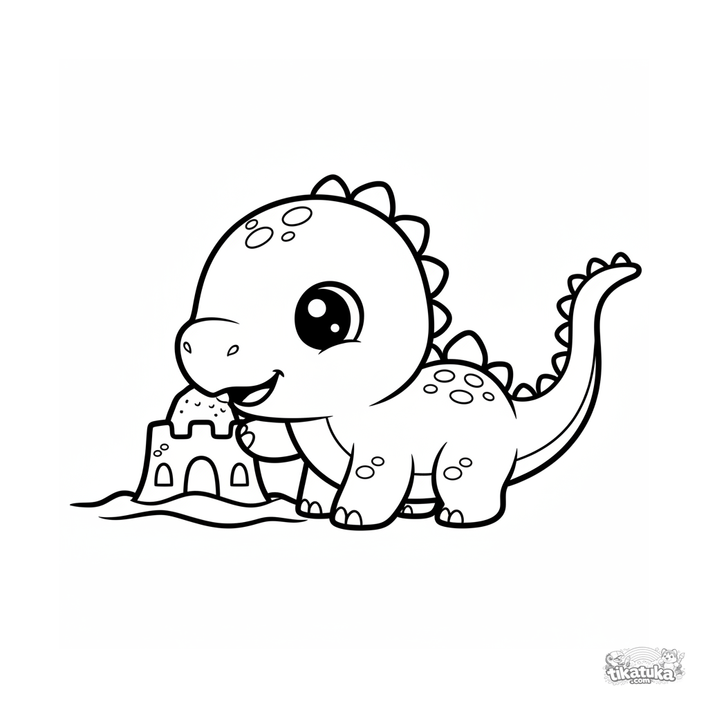 Página para colorir para bebês 2-3: um filhote de estegossauro construindo um castelo de areia na margem de um oceano antigo.