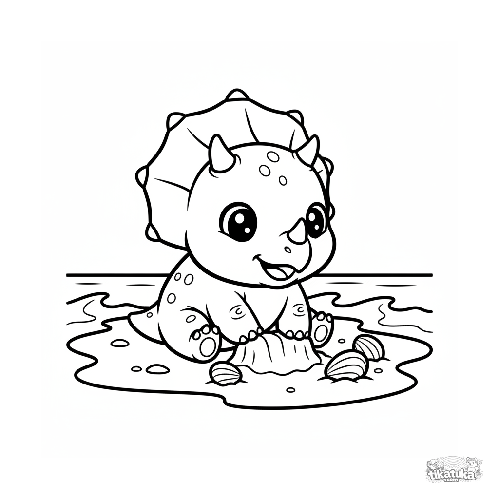 Página simples para colorir para crianças pequenas de 2-3 anos: um filhote de tricerátopo cava na areia de uma praia antiga procurando mariscos. Formas grandes, poucos detalhes.