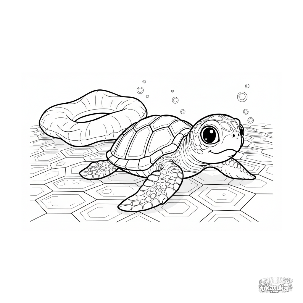 Página para colorir para crianças 7-9: uma tartaruguinha explora os azulejos padronizados no fundo de uma piscina perto de um anel vazio. Detalhe moderado, tema educativo de exploração.