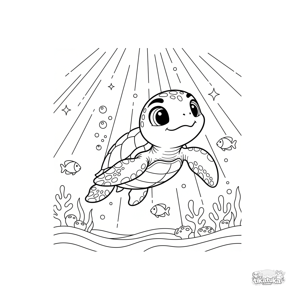 Página para colorir para 7-9 anos: um filhote de tartaruga marinha recém-nascido nadando em direção à superfície em um raio de sol em águas rasas.