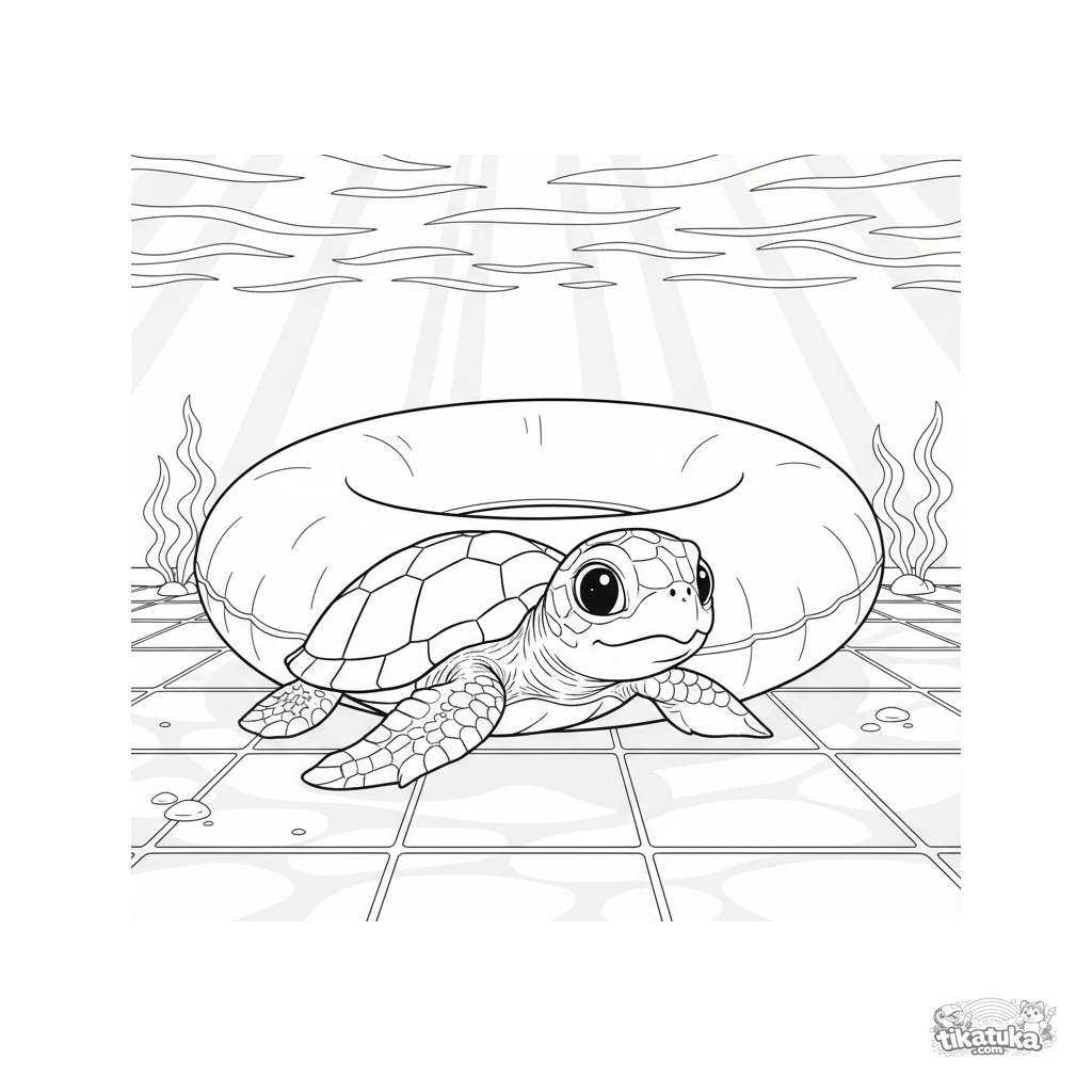 Página para colorir para crianças de 7-9 anos: uma pequena tartaruguinha espreita curiosa de baixo de um anel inflável no fundo da piscina.