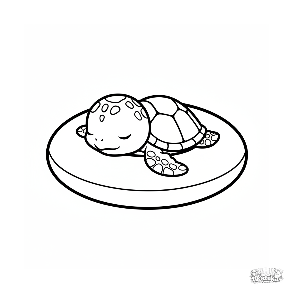 Página para colorir simples para bebês 2-3: uma tartaruga bebê dorme dentro de uma boia no fundo da piscina. Formas grandes, muito poucos detalhes, margens amplas.
