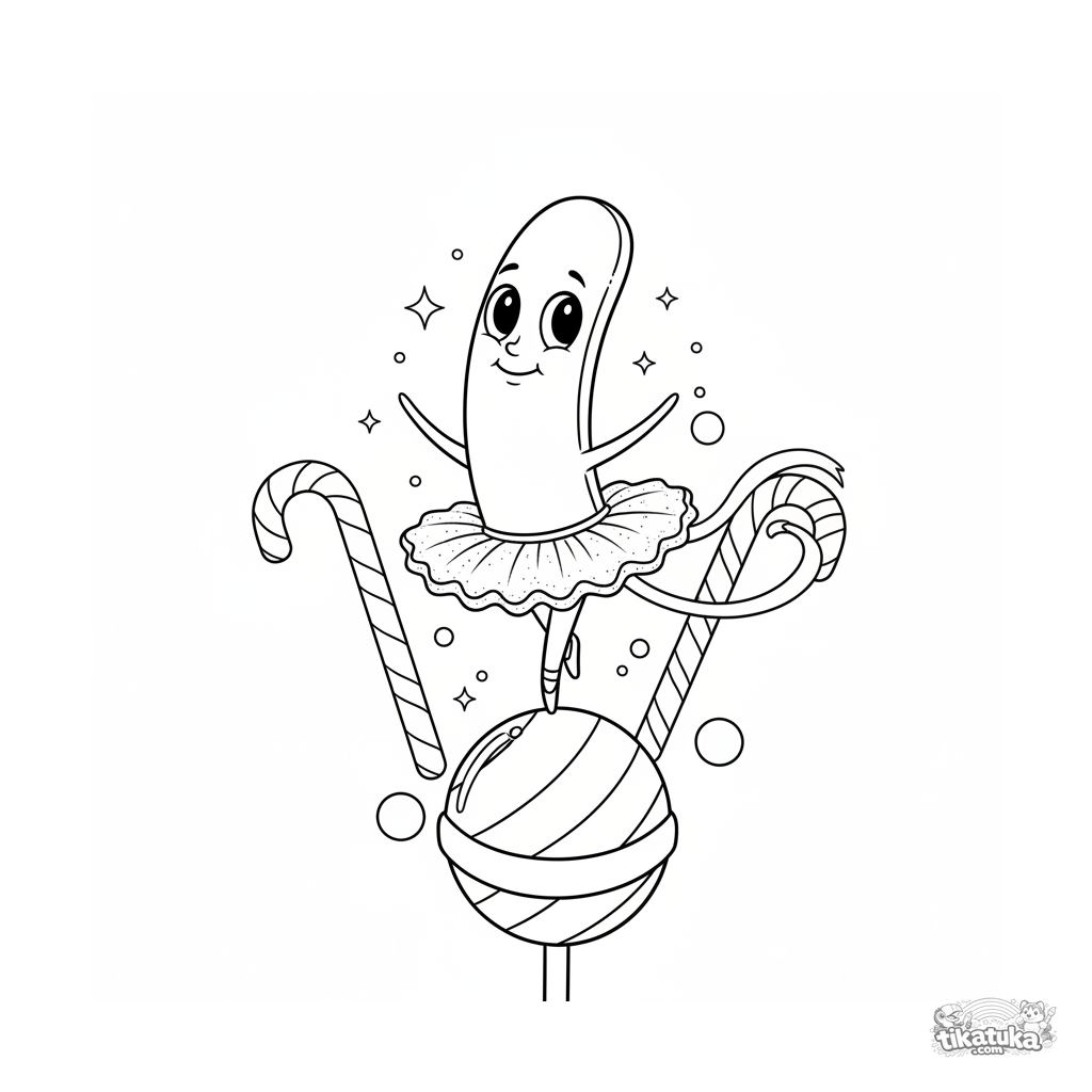 Página para colorir para 7-9 anos no estilo Disney: um bacilo bailarina graciosa em tutu de açúcar dança na ponta de um pirulito. Linhas fluidas.