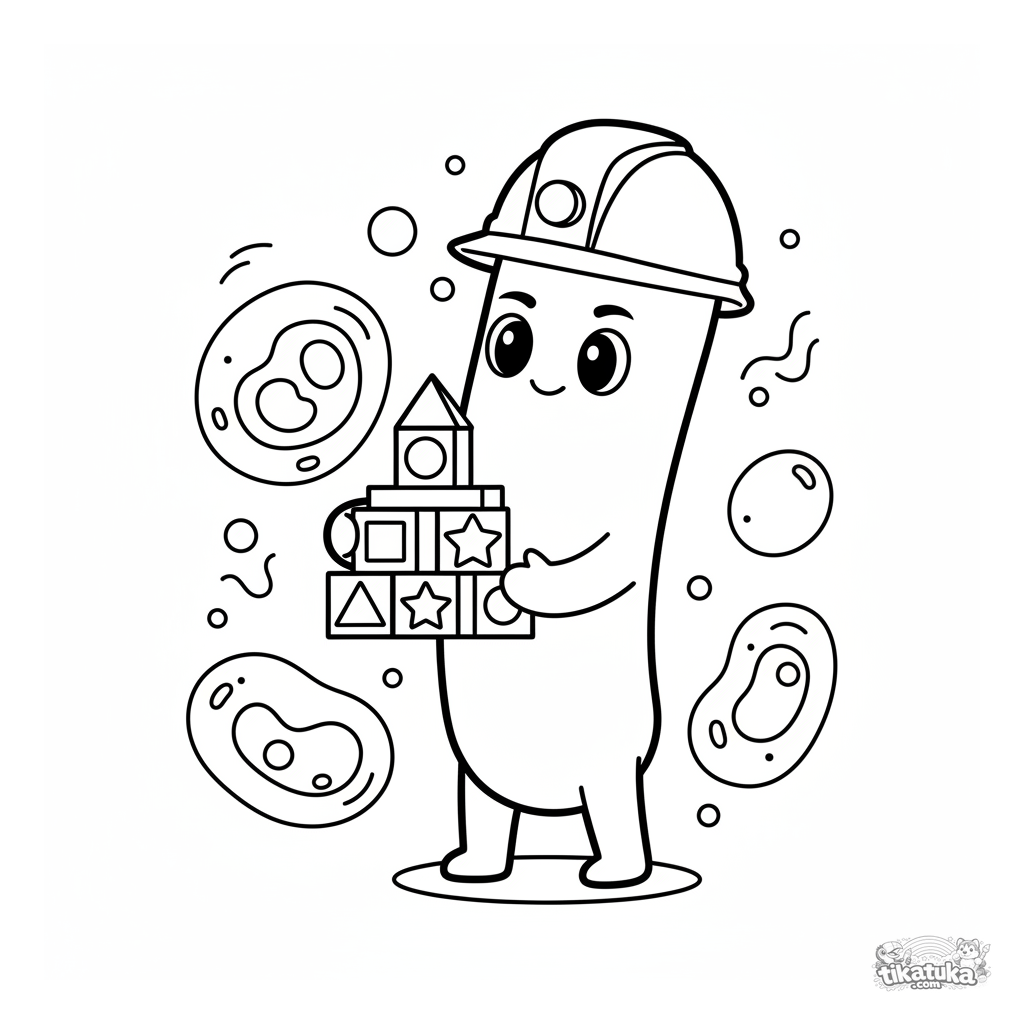 Página para colorir de um bacilo construtor em um mundo celular. Para crianças de 4 a 6 anos. Estilo chibi fofo, ações claras, margens amplas.