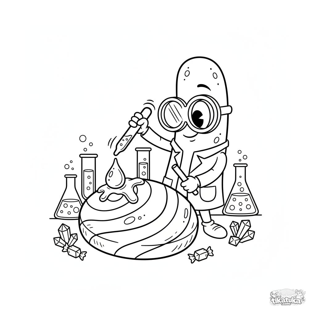 Página para colorir para crianças 4-6 anos: uma bactéria bacilo cientista com óculos e jaleco faz uma experiência na superfície de um pirulito. Estilo retrô divertido dos anos 30.