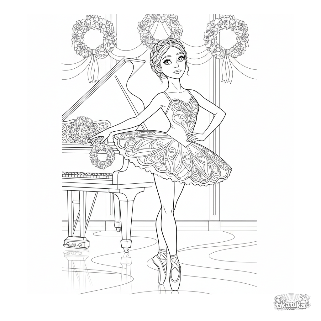 Página complexa para colorir para crianças maiores 10-12: uma bailarina de tutu pratica uma pose graciosa perto de um piano de cauda em um salão festivo decorado.