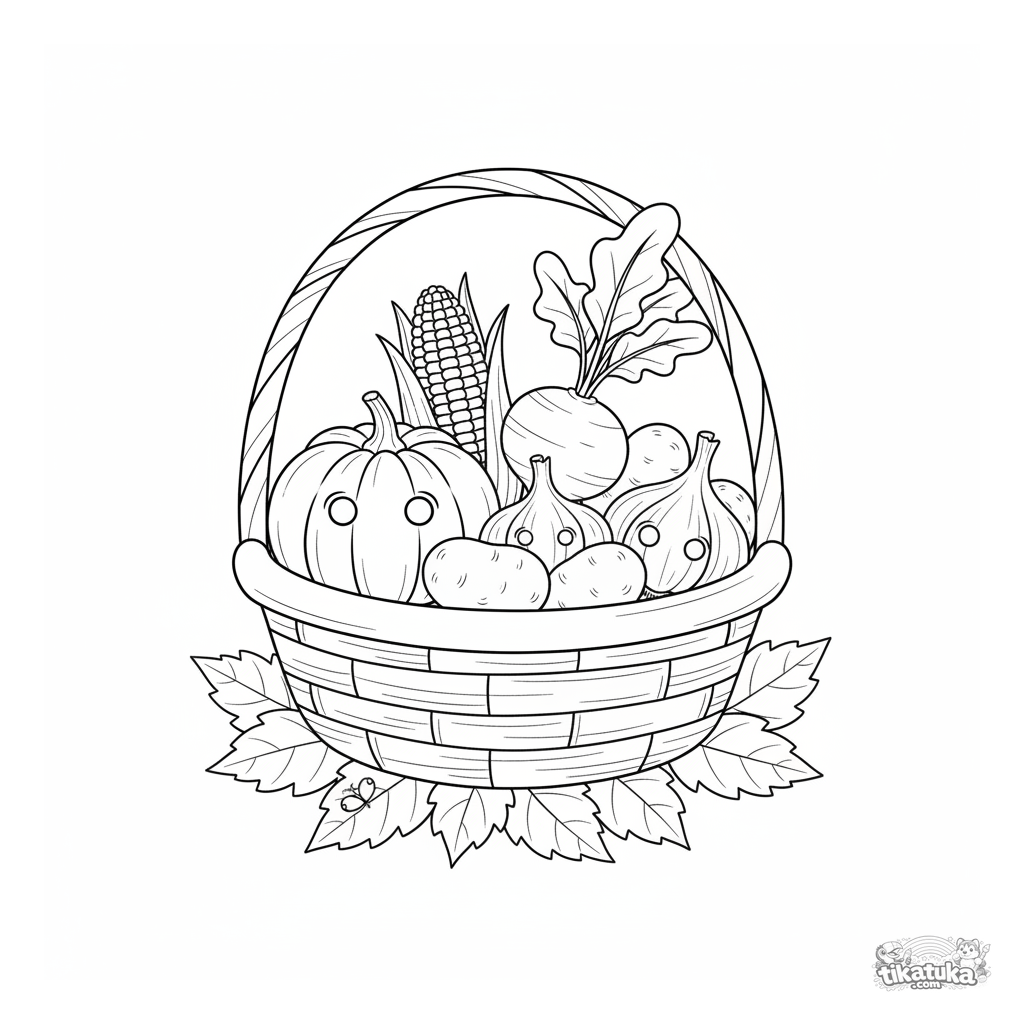 Página para colorir complexa para 10-12 anos: uma cesta rústica transbordando legumes de outono. Natureza morta detalhada no estilo esboço-aquarela.