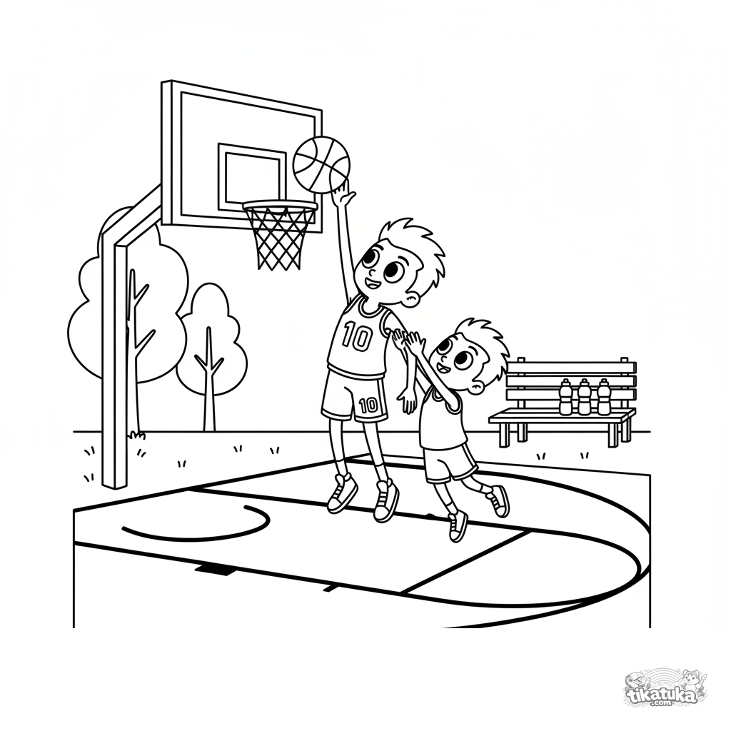 Página para colorir: um jogador de basquete executa uma enterrada em uma quadra externa. Para 4-6 anos, cena dinâmica com ação esportiva.