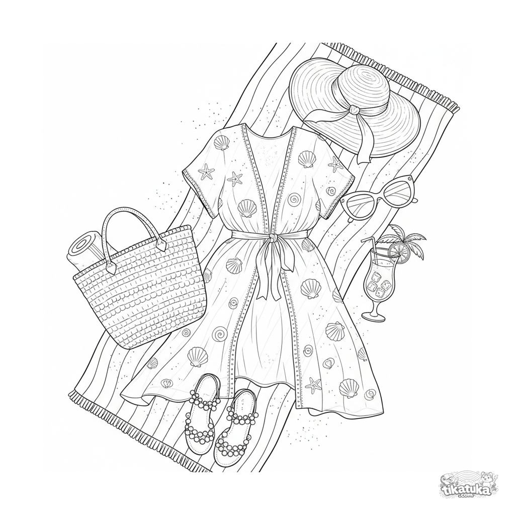 Página para colorir detalhada para meninas: uma disposição plana de um visual de praia completo com uma cobertura, chapéu, bolsa e outros acessórios sobre uma toalha com areia.