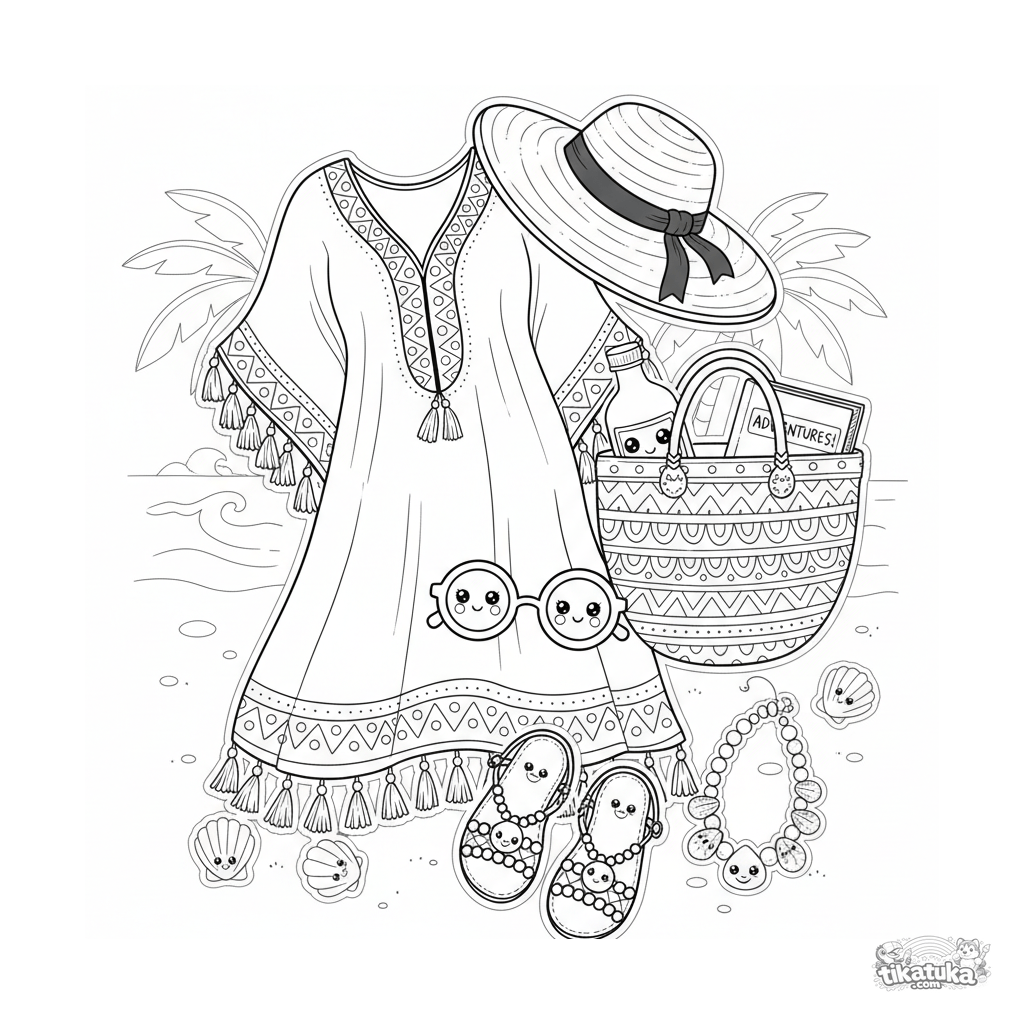 Página vibrante para colorir para meninas 10-12: roupa de praia com caftan, chapéu e acessórios dispostos na areia. Texturas detalhadas, fundo com coqueiros e oceano.