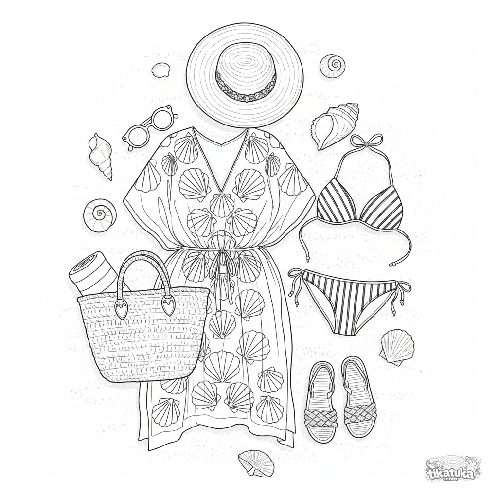 Página para colorir detalhada para 10-12 anos: conjunto de praia em disposição plana na areia com canga, biquíni, chapéu e acessórios. Tema verão com muitas texturas.