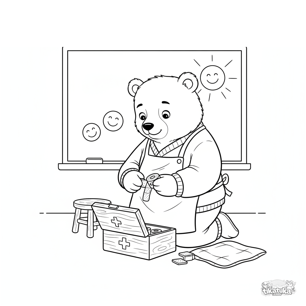 Página para colorir para crianças 4-6: um urso cuidador gentil com um kit de primeiros socorros no quadro da sala de aula infantil. Cardigã, avental, ataduras, expressão tranquilizadora.
