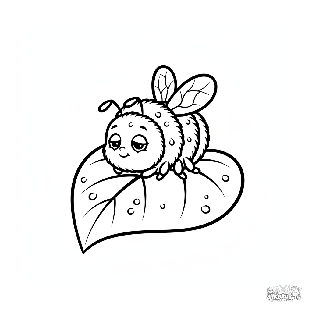 Página para colorir simples para crianças pequenas 2-3: uma abelha fofa descansa em uma folha grande com gotas de orvalho. Formas grandes e claras.