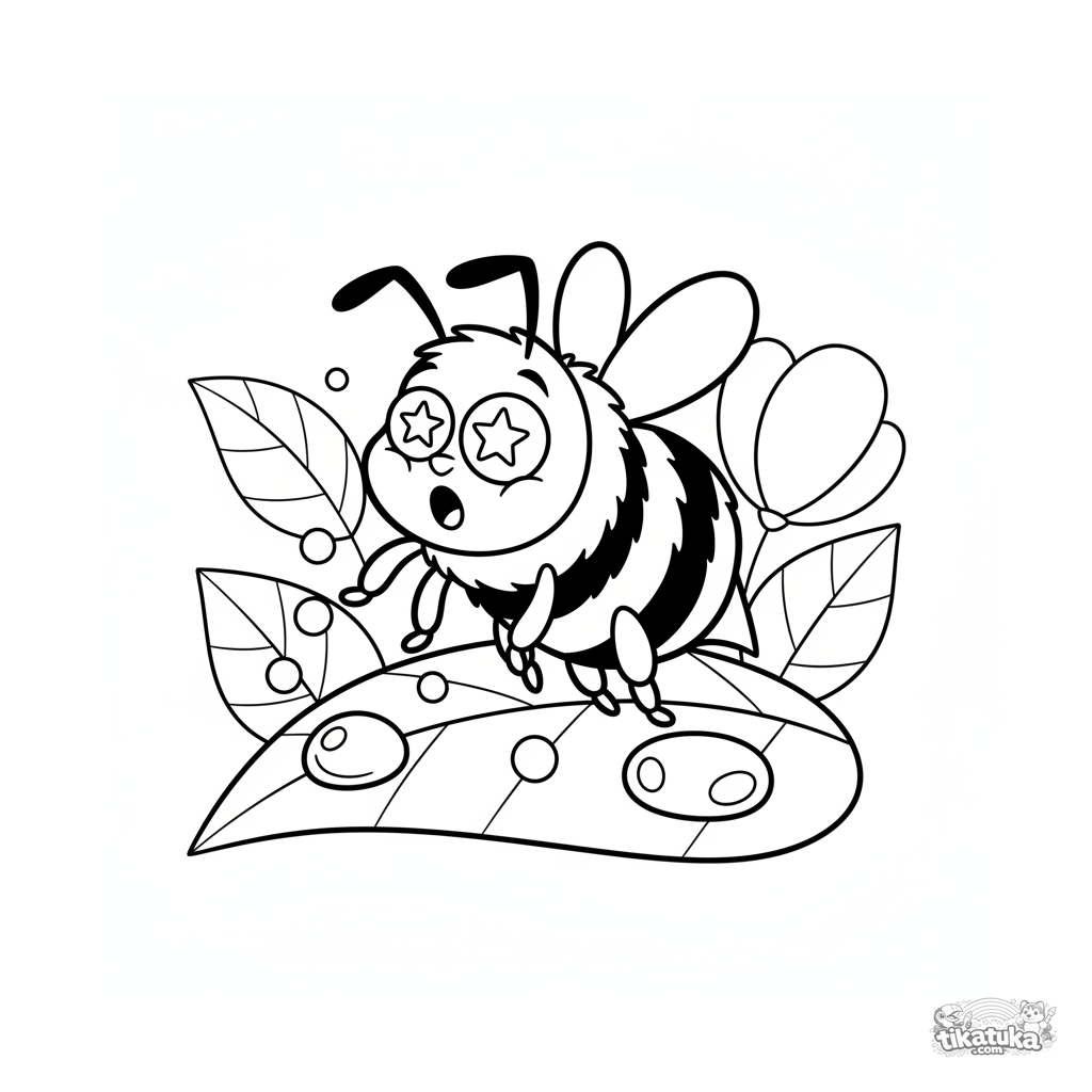 Página para colorir para pré-adolescentes de 7-9 anos: uma mamangava peluda escorrega em uma grande gota de orvalho em uma folha. Pose engraçada no estilo anos 90-nickelodeon, emoções expressivas, detalhes moderados.