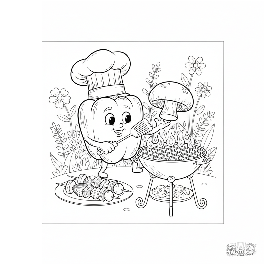 Página para colorir detalhada para 10-12 anos: um pimentão chef cozinhando em uma grelha de jardim. Estilo realista de guia de campo.