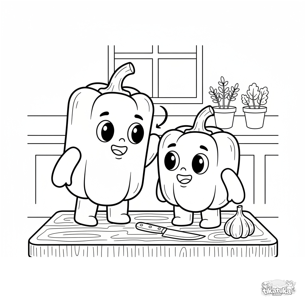 Página para colorir de dois pimentões em uma tábua de cortar. Para crianças 4-6. Pimentões interagindo, com faca e alho.