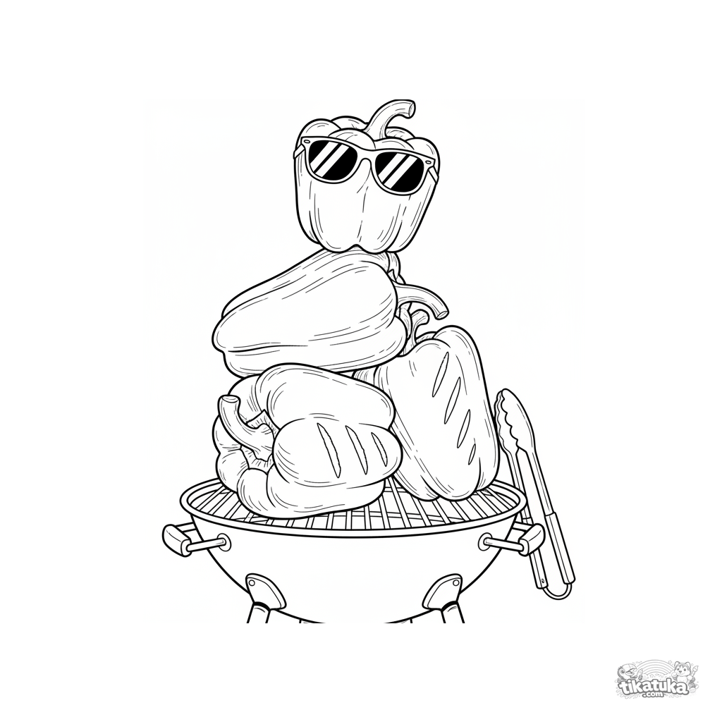 Página para colorir detalhada para crianças mais velhas 10-12: três pimentões com personalidades diferentes em uma churrasqueira de jardim. Detalhes realistas, sombras da grelha.