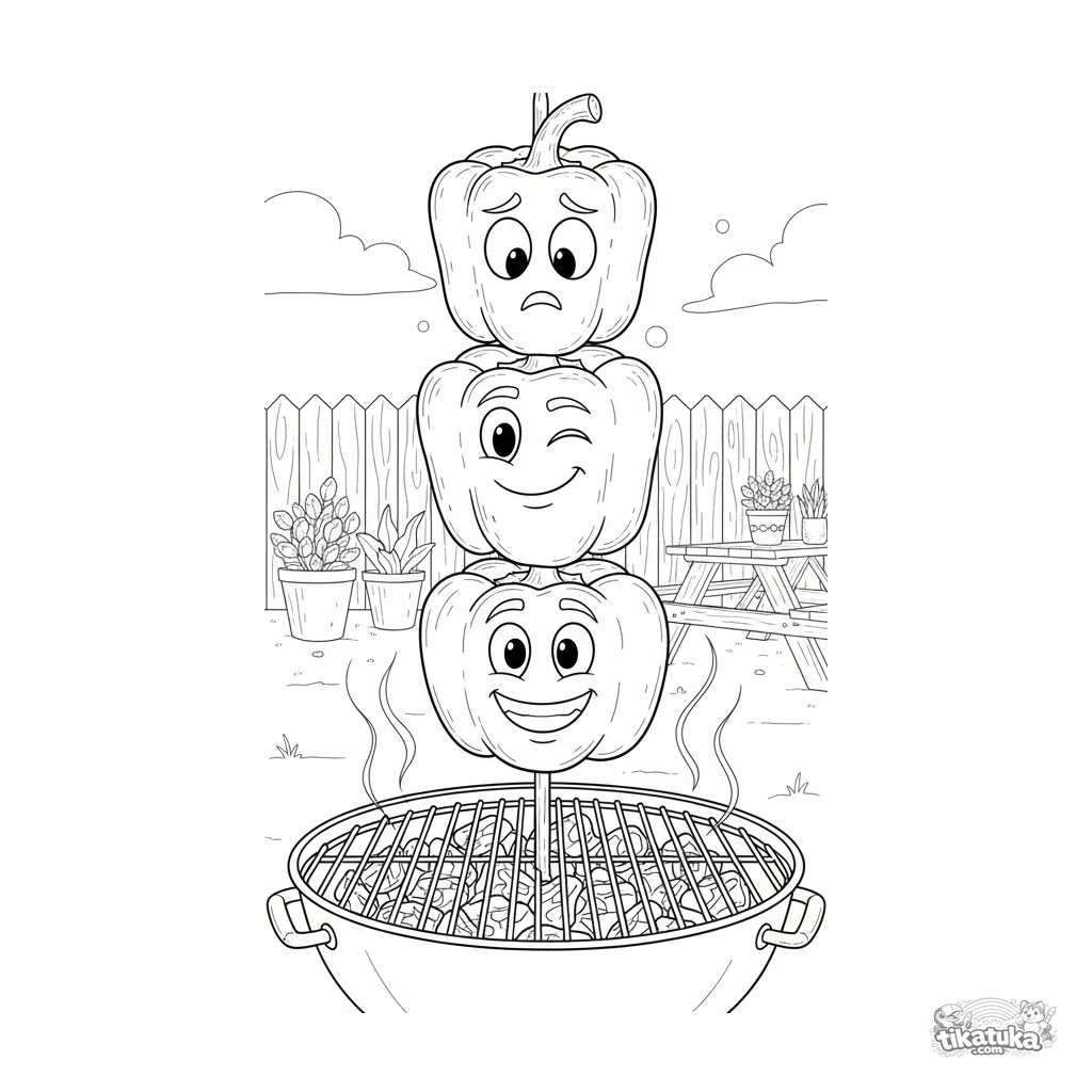 Página para colorir detalhada para 10-12 anos: três pimentões num espeto sobre brasas no jardim. Contornos realistas, emoções diferentes, margens largas.